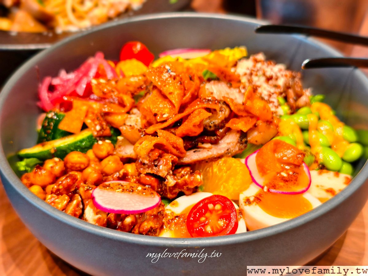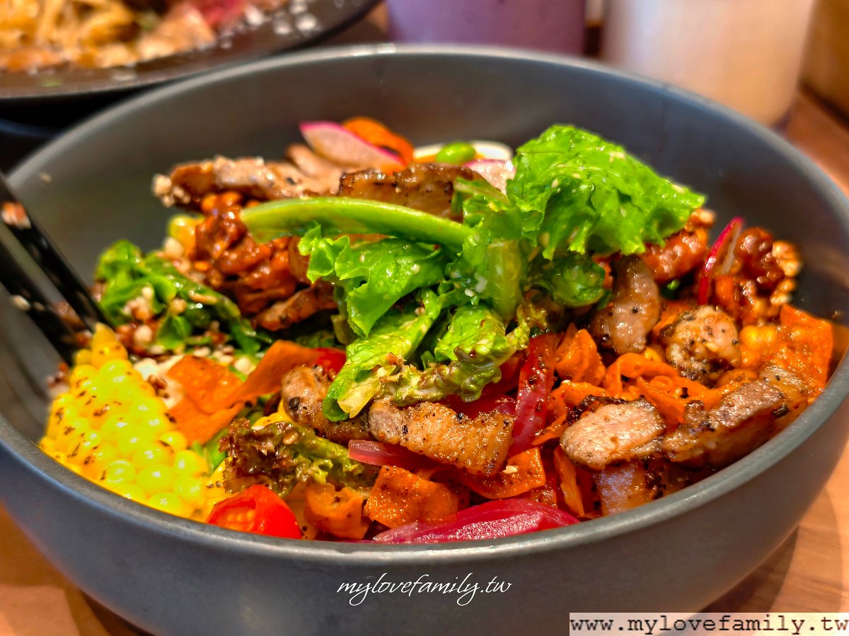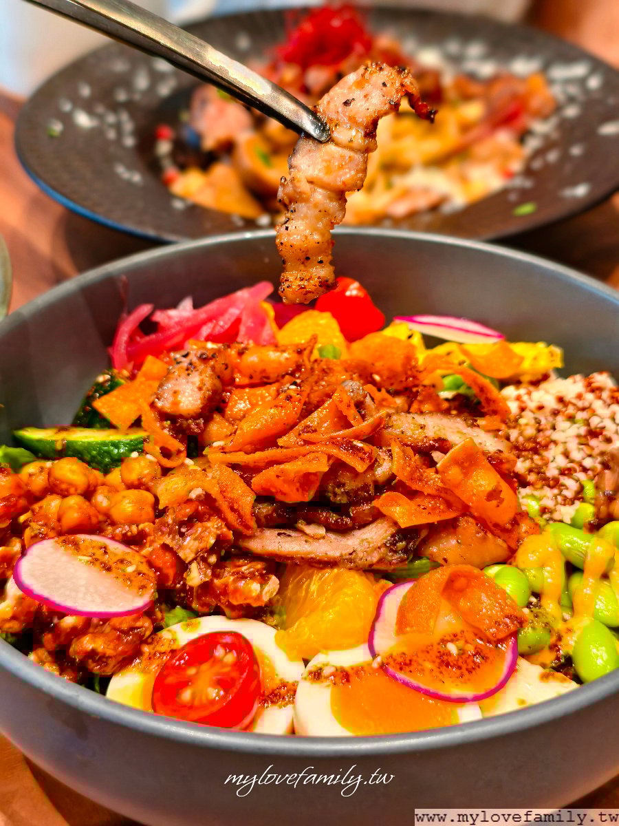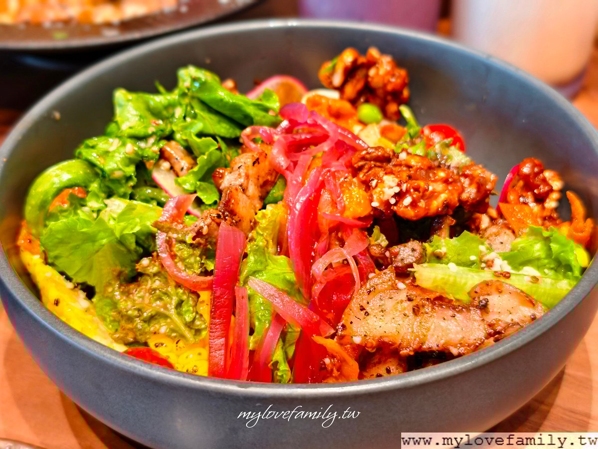 青花椒鹹豬肉胡麻沙拉,這一份送上來時,我們好驚訝的討論著,這一份真的只要$280元嗎?還再次看了菜單,沒錯,真的是$280元,沒想到一份沙拉的內容物如此多元,除了生菜及青花椒鹹豬肉之外,溏心蛋、鷹嘴豆、毛豆、焦糖核桃、藜麥、小黃瓜、玉米、小蕃茄、橘子、甜菜根….,這一份營養滿分,這些材料準備起來很費工,吃過N家餐廳的沙拉,這一份青花椒鹹豬肉胡麻沙拉可說是我心中的第一名。