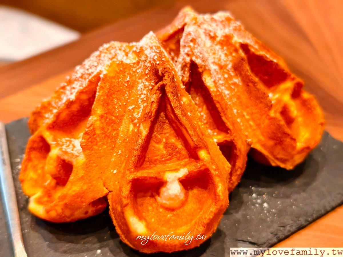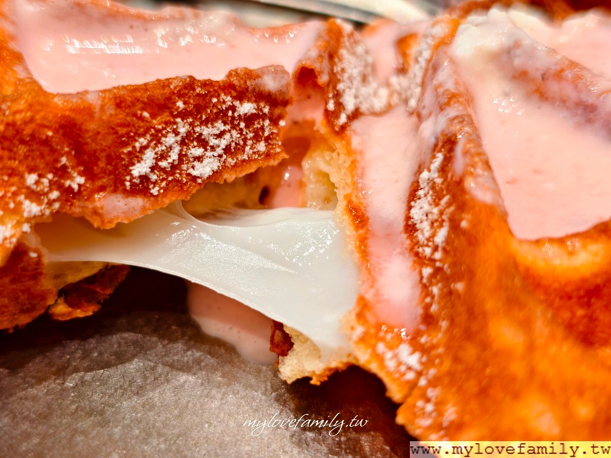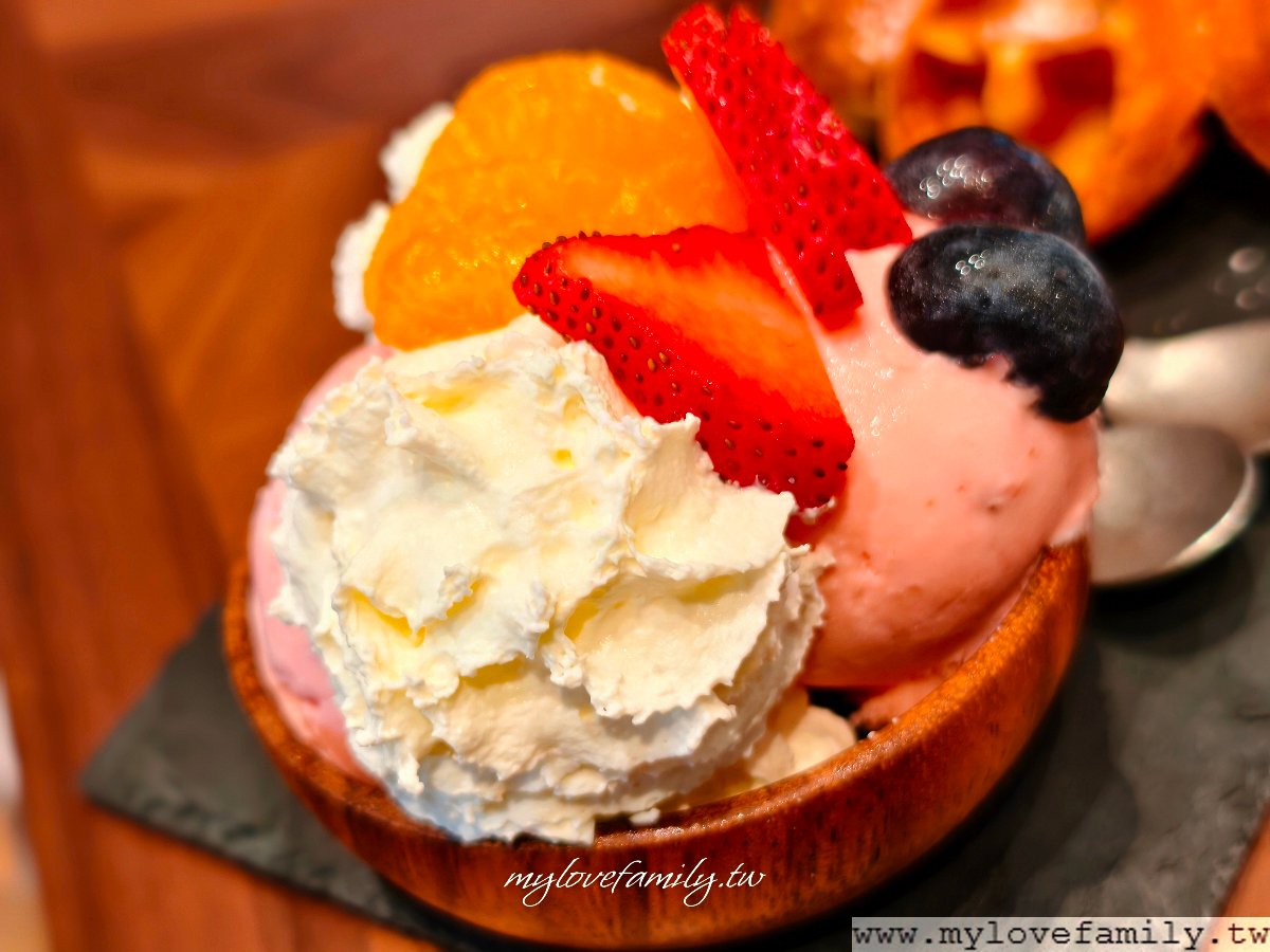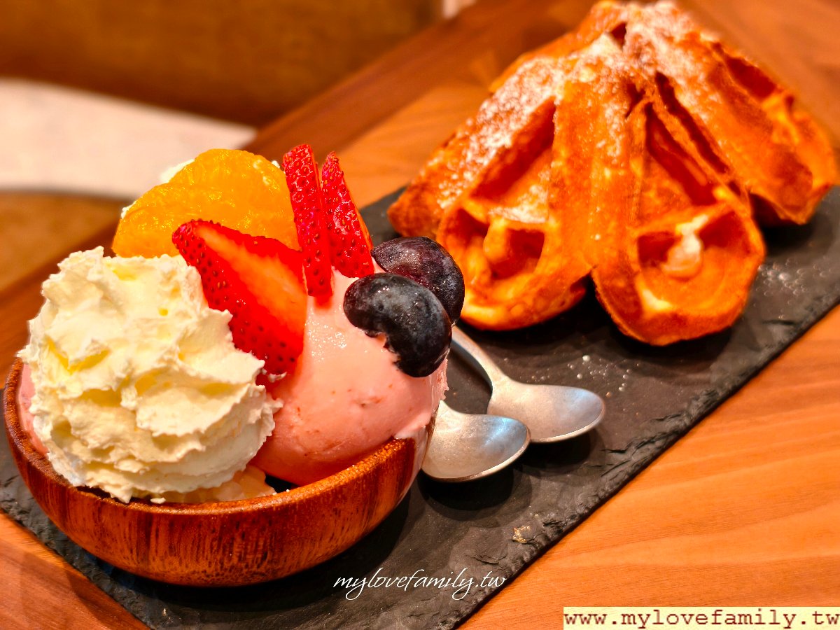 外酥內軟又Q彈的浮島草莓麻糬鬆餅,每一口都有草莓的香氣,同時搭配鮮奶油、冰淇淋,就算吃的再飽,甜點永遠都吃的下的概念。