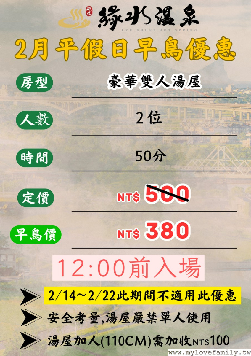 【綠水溫泉】2月份優惠活動,中午12點前入場,豪華雙人湯屋早鳥價$380元。
