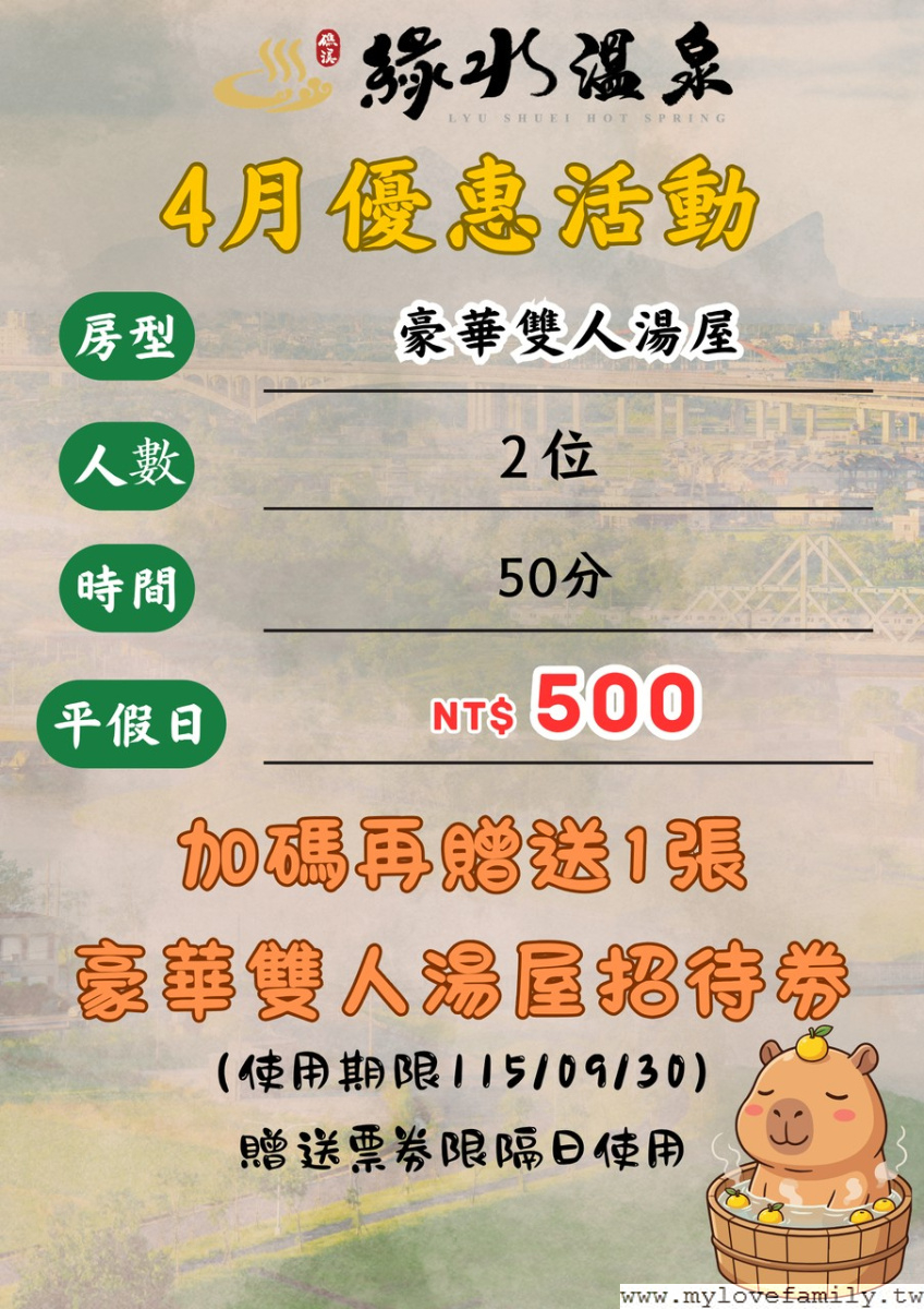 四月份優惠活動,豪華雙人湯屋$500,加碼再送一張豪華雙人湯屋招待劵,等於平均下來,雙人泡湯一次只要$250好划算。
