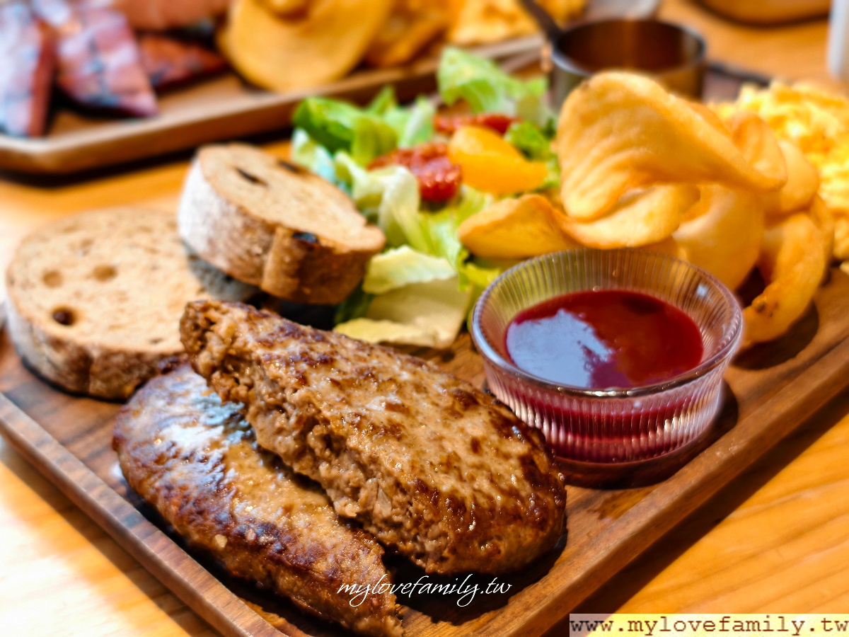 我點的莓果漢堡排 $350元,第一次吃這的漢堡排,多汁的濕式手打牛肉/豬肉混合漢堡排,加上莓果醬的酸甜味能中和肉排油脂,吃起來非常爽口,也可把莓果醬塗抹在歐式麵包上,味道也很協調。