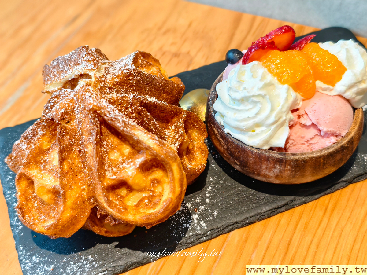平日到訪的好處是只要沒客滿,就能繼續在這喝咖啡聊聊天,我們從早上十點坐到下午二點半才離開,下午一點多又加點了浮島麻糬草莓鬆餅,現烤金黃色鬆餅皮酥脆,熱熱的吃最好吃,內層有軟糯Q彈的麻糬,加上外層酥脆的口感層次分明。