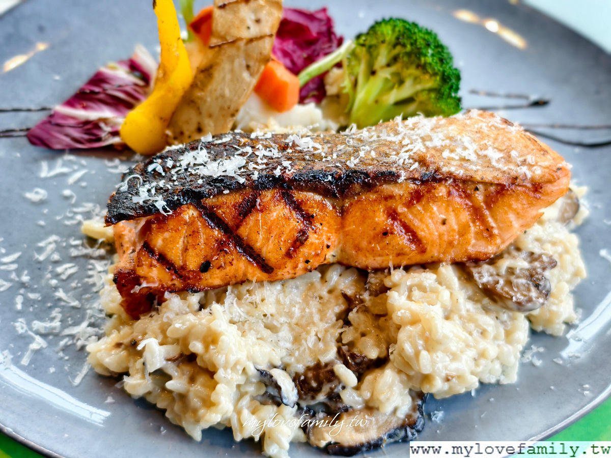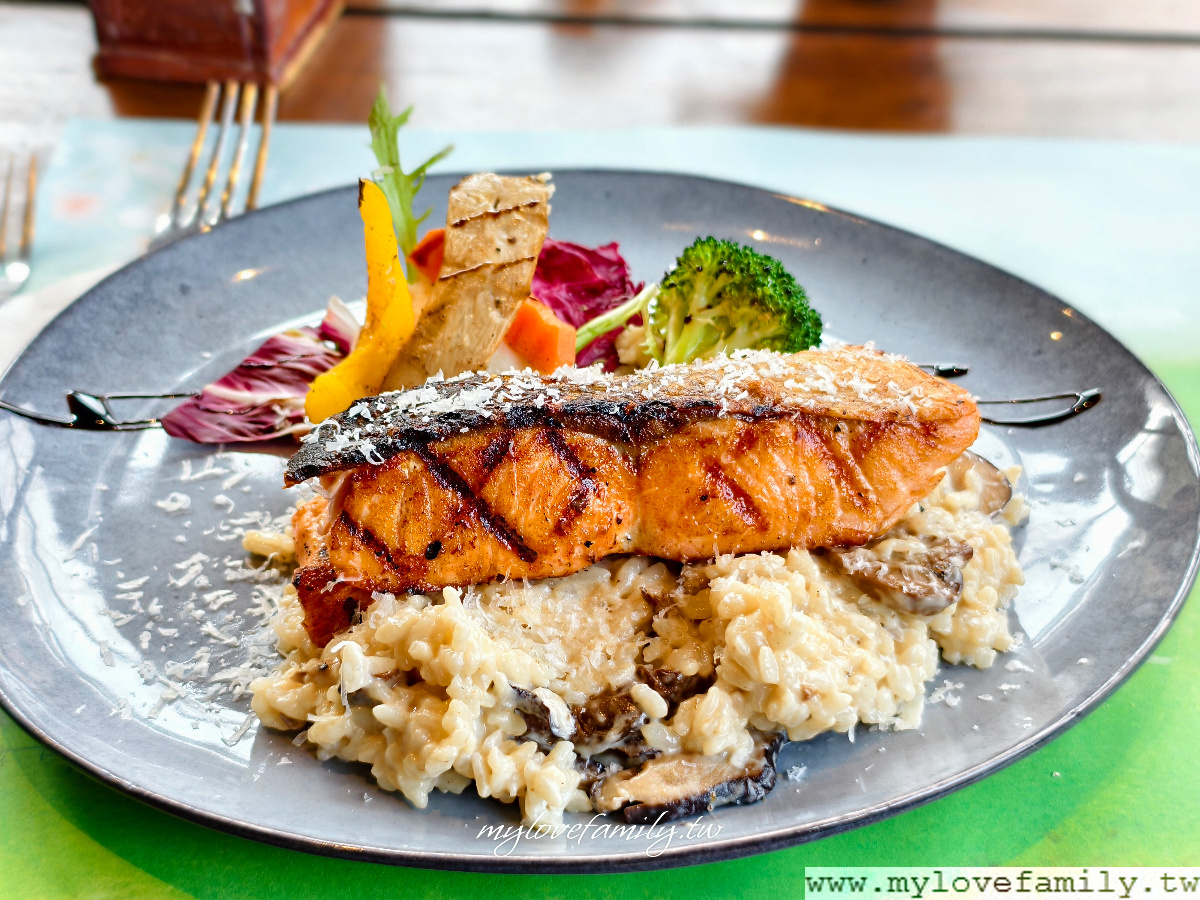 青少年點的嫩煎鮭魚佐牛肝菌蘑菇燉飯,鮭魚煎至外焦內嫩、富含油脂香氣,很有水準。搭配吸滿牛肝菌鮮香的燉飯,米粒帶有獨特咬勁,是我們喜歡的口感。