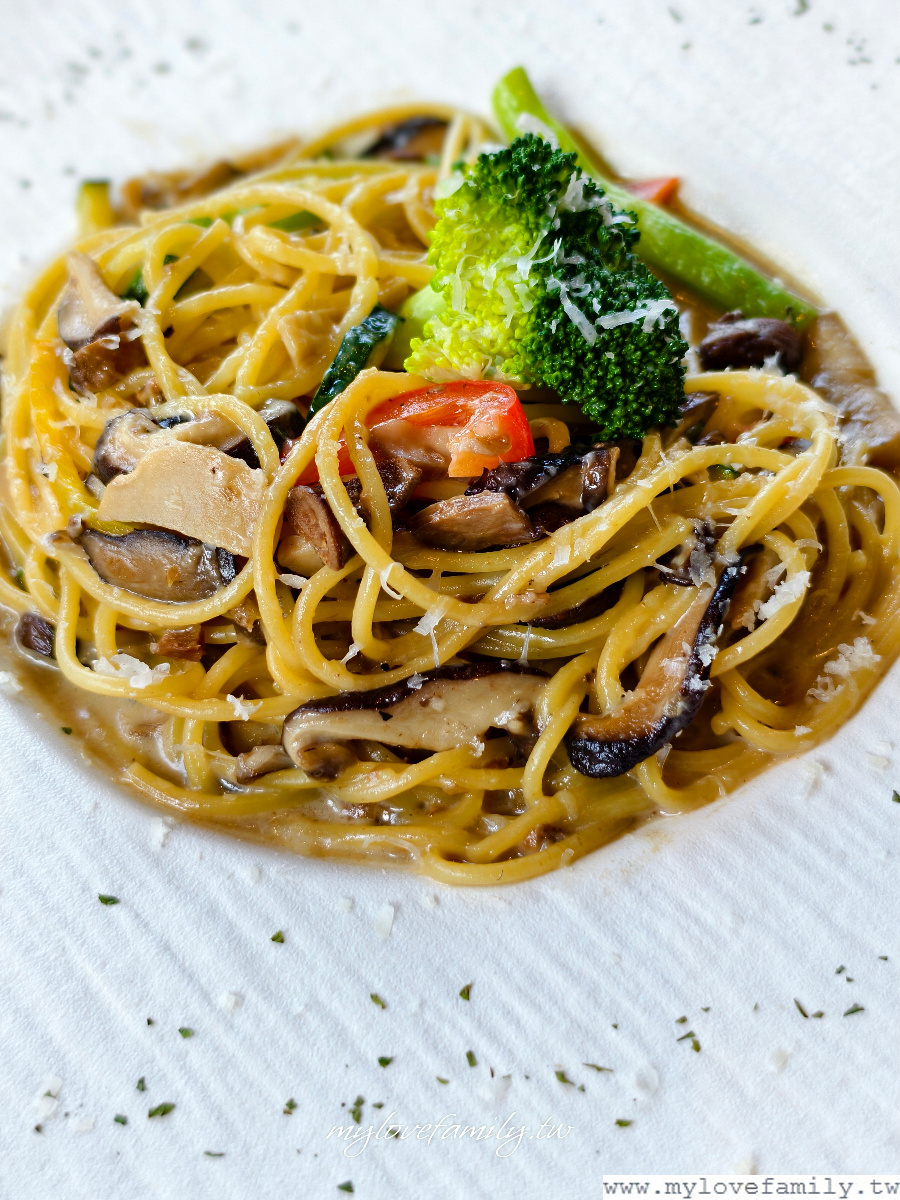 青少年的素牛肝菌義大利麵,醬汁鹹香夠味,牛肝菌本身帶有嚼勁,烹煮後香氣依然濃郁。