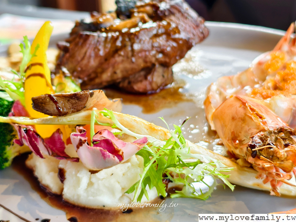 戶長點的菲力牛排&大蝦干貝$980,牛排的份量看起來不大,但口感很棒,鮮嫩多汁不會乾柴,在山林之間,能有這麼有水準的美食,為了餐點可以多來幾次。