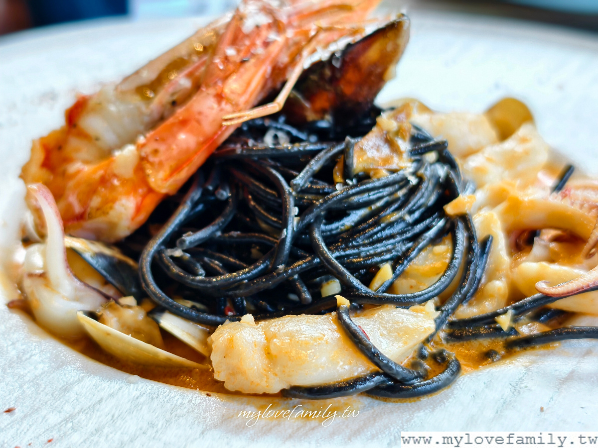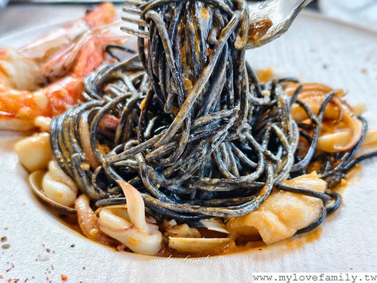 我點的海鮮墨魚麵$550,這一份令我回味無窮,麵條完整吸附墨魚汁精華,帶有特殊的鮮甜海味與鹹香,每一口都好涮嘴,並配有嫩滑的鮮蝦、小卷、魚片,口感層次豐富。