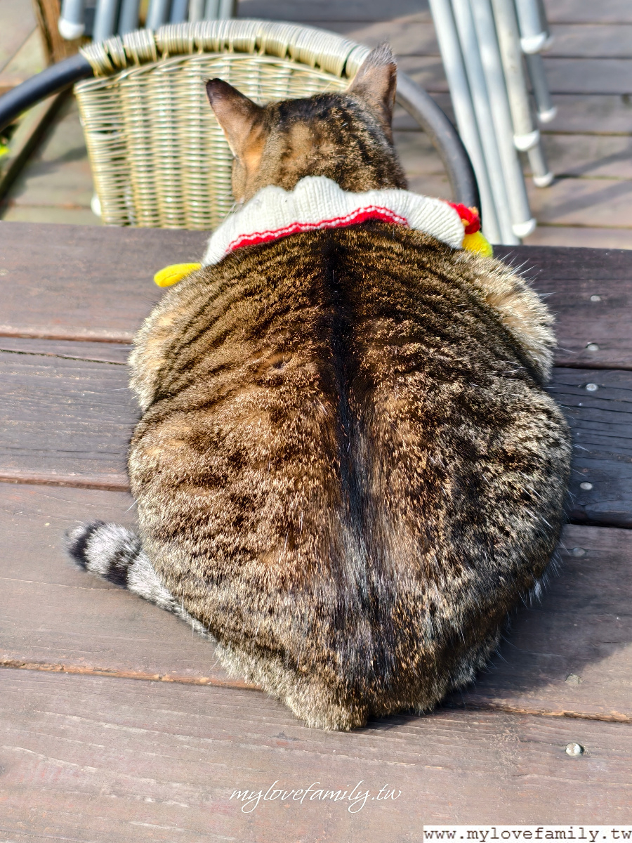 我在另一棟的二樓往下拍攝父子三人及貓的互動,完全也是各自安好狀態。