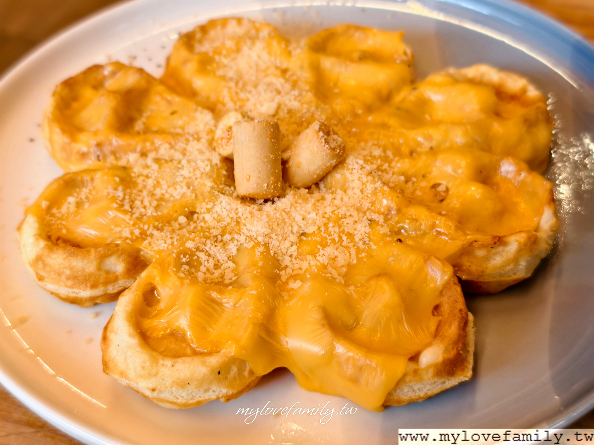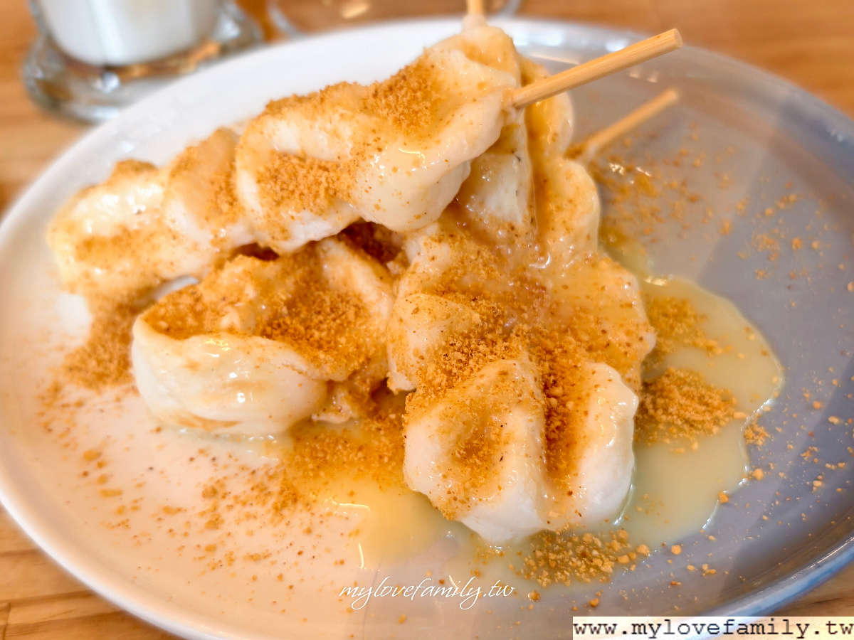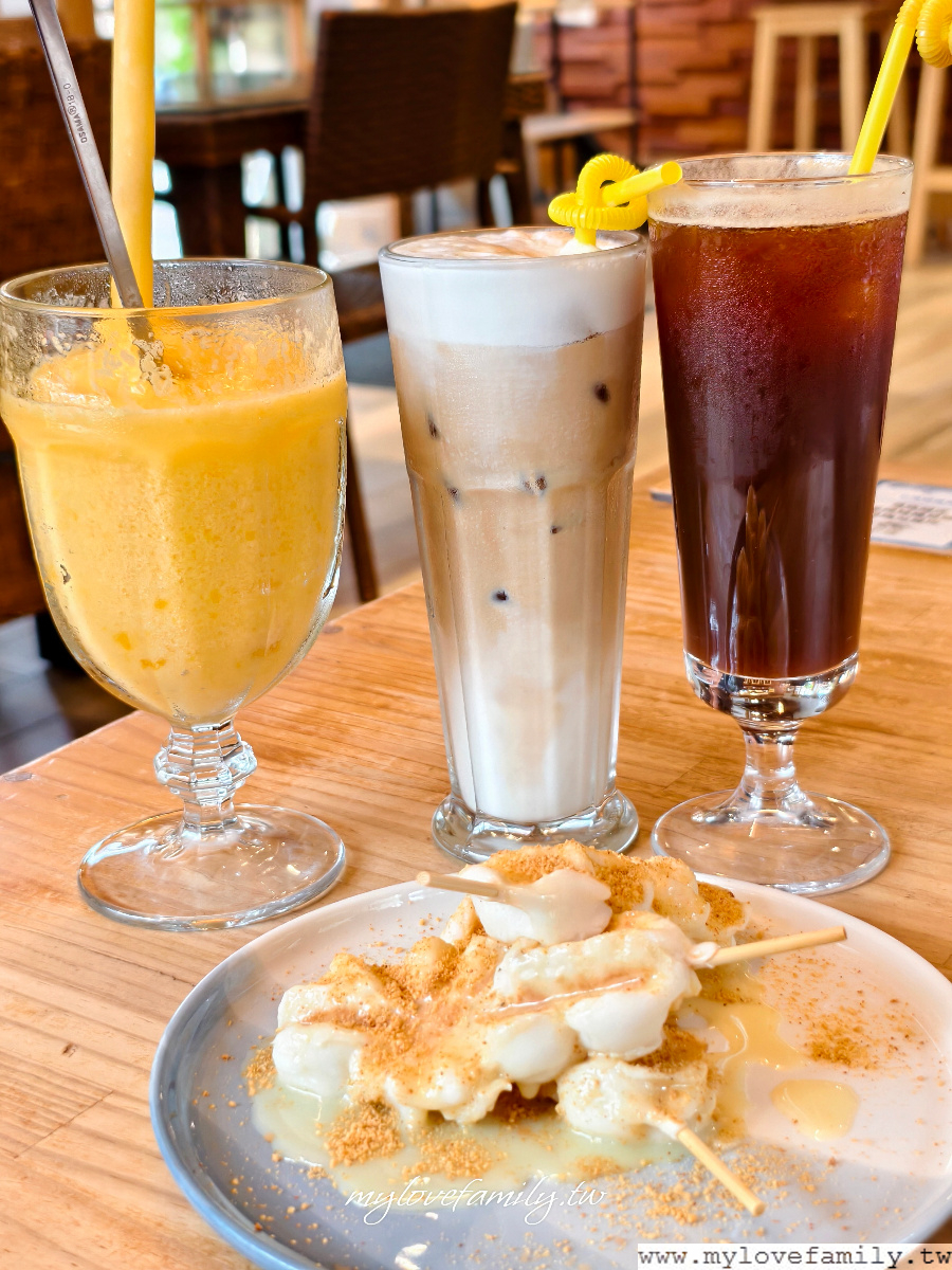 串烤麻糬及玉米起司鬆餅,再搭著咖啡、拿鐵、芒果冰沙,在這直接用每張門票抵$100,四張門票就使用完畢。