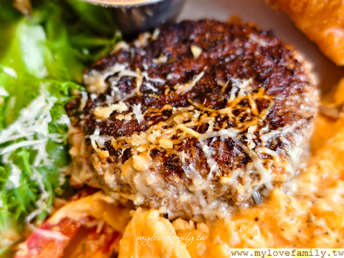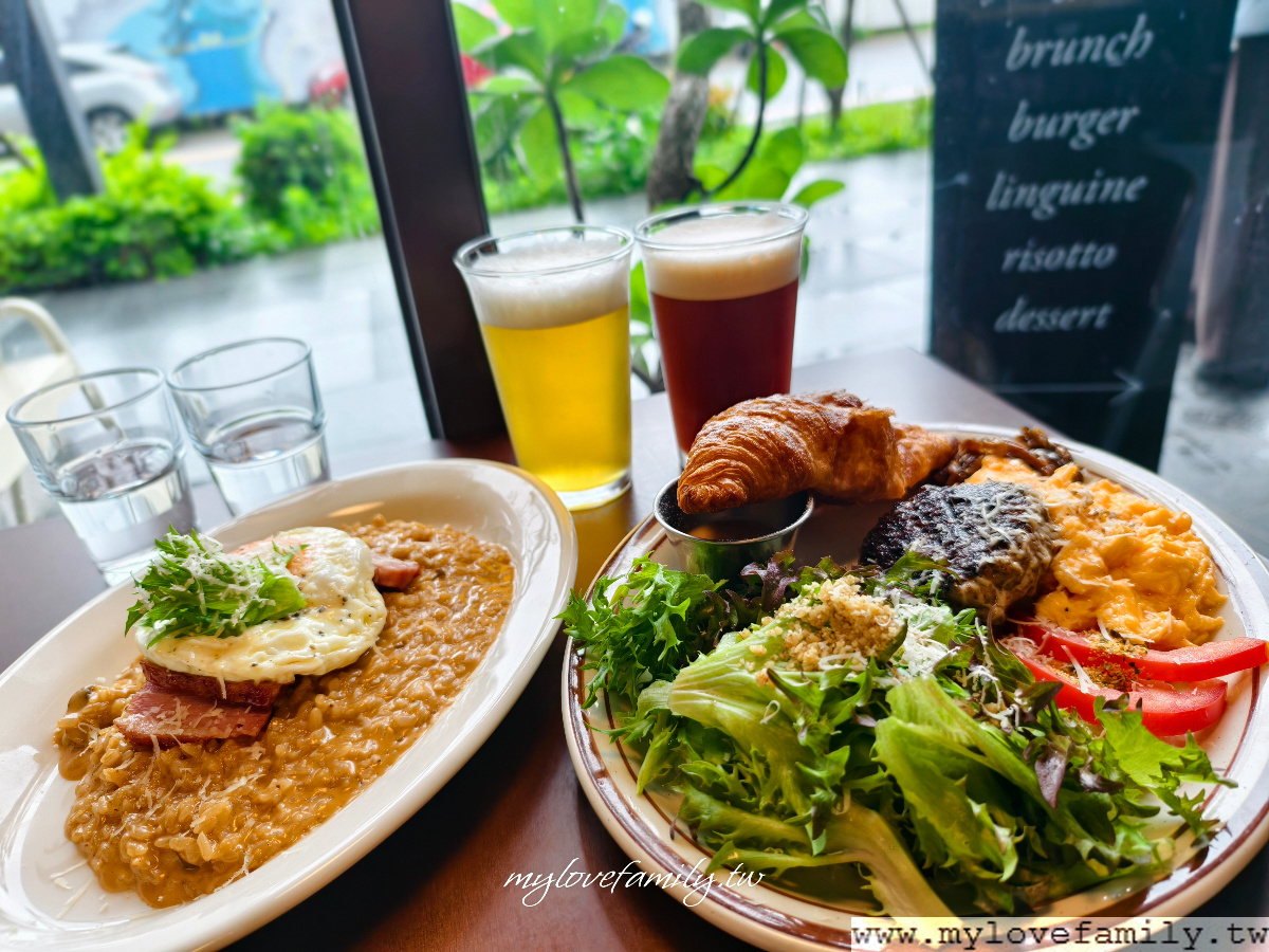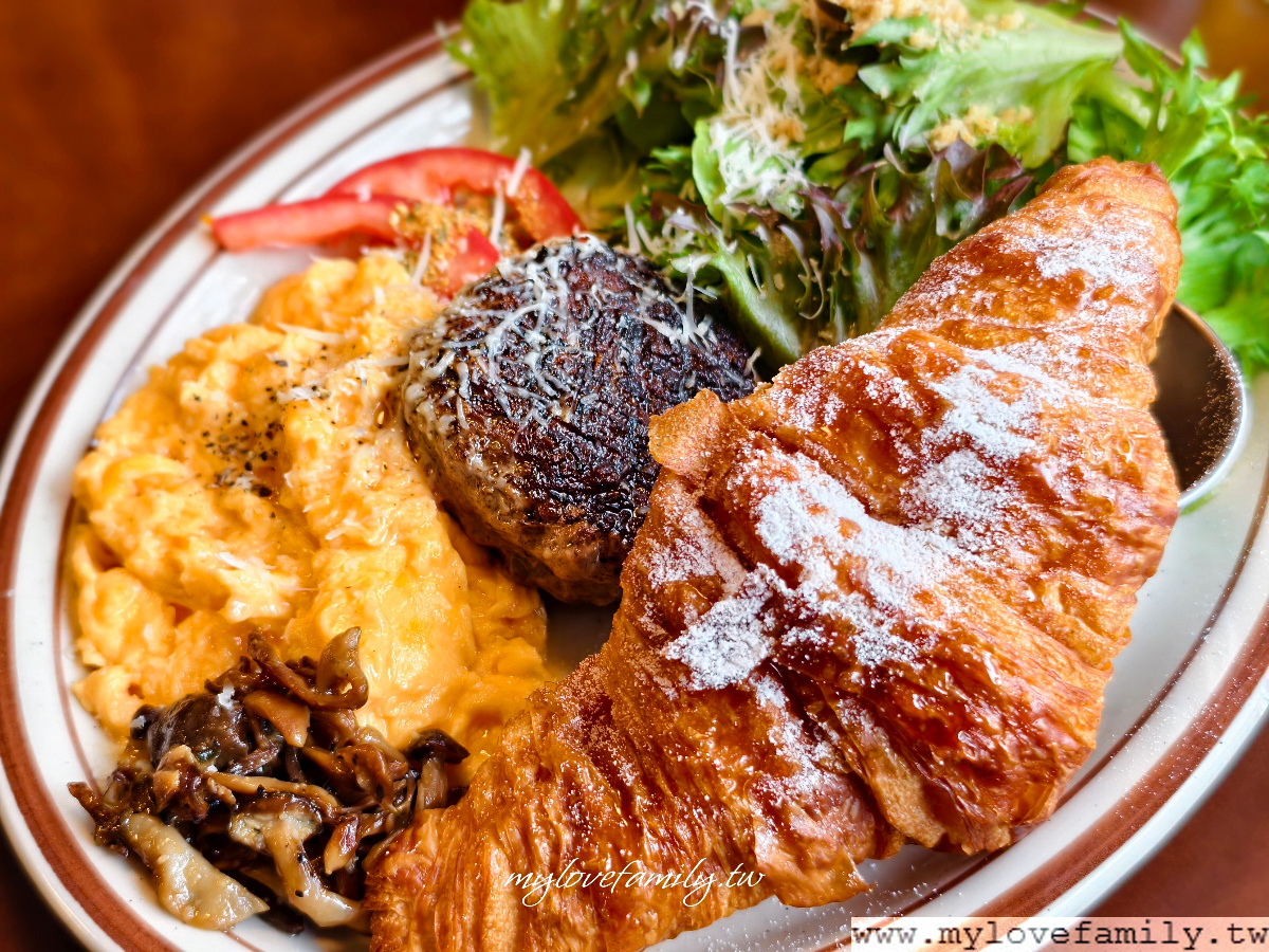 手打牛肉排與可頌及焦糖鴨胸奶油燉飯,我點的手打牛肉排與可頌份量十足,光是視覺上就很滿意,誠意十足的有機水耕菜、炒蛋、炒菇、蕃茄,營養滿分,外加厚實的手打牛肉漢堡排,鮮嫩多汁的口感,調味也很剛好,完全就是超值早午餐盤。