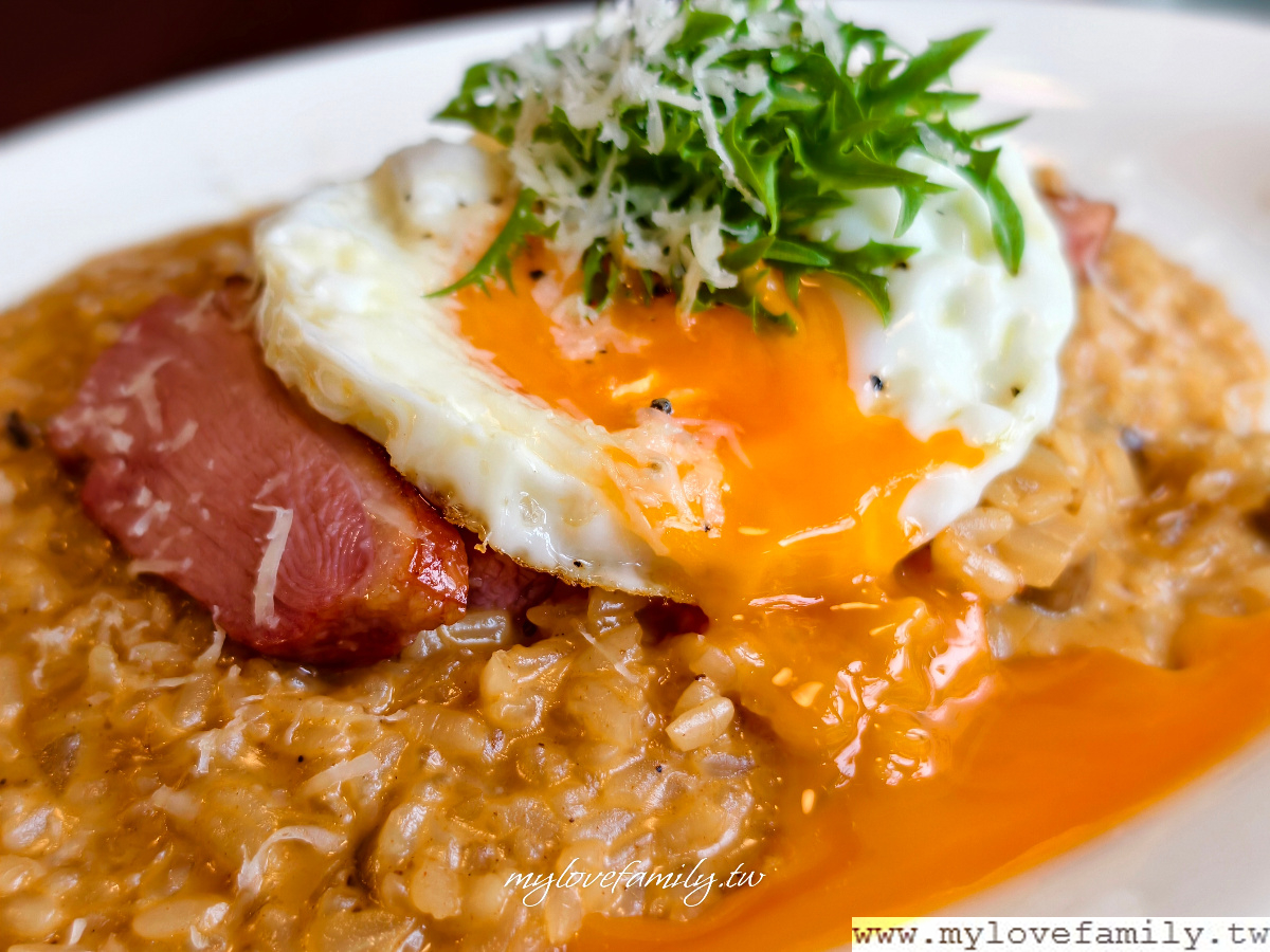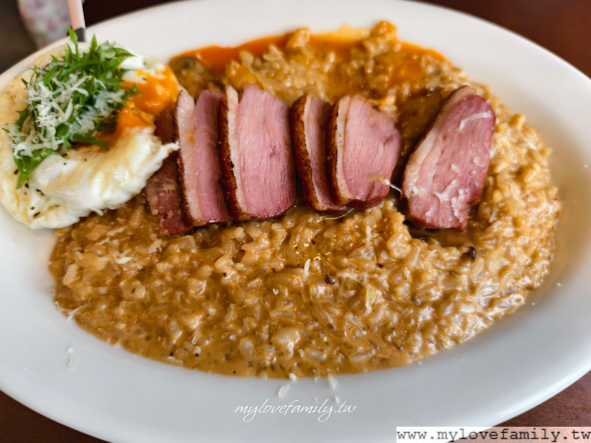 姐妹點的焦糖鴨胸奶油燉飯加價25元的太陽蛋,搭起來更是豐盛满分。