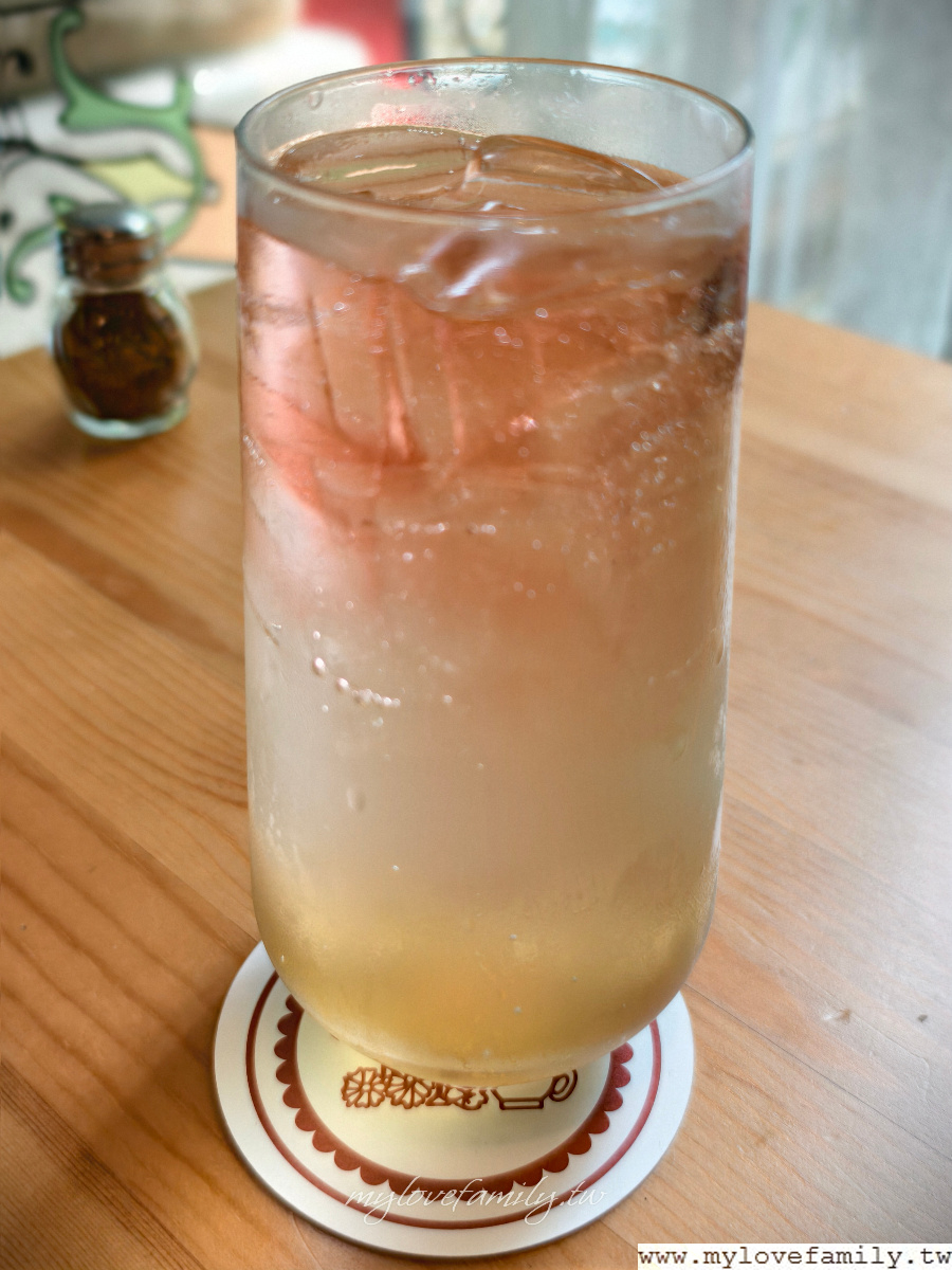 有漸層色的白葡萄氣泡飲,有葡萄果香及細緻的氣泡感,很消暑的飲品。