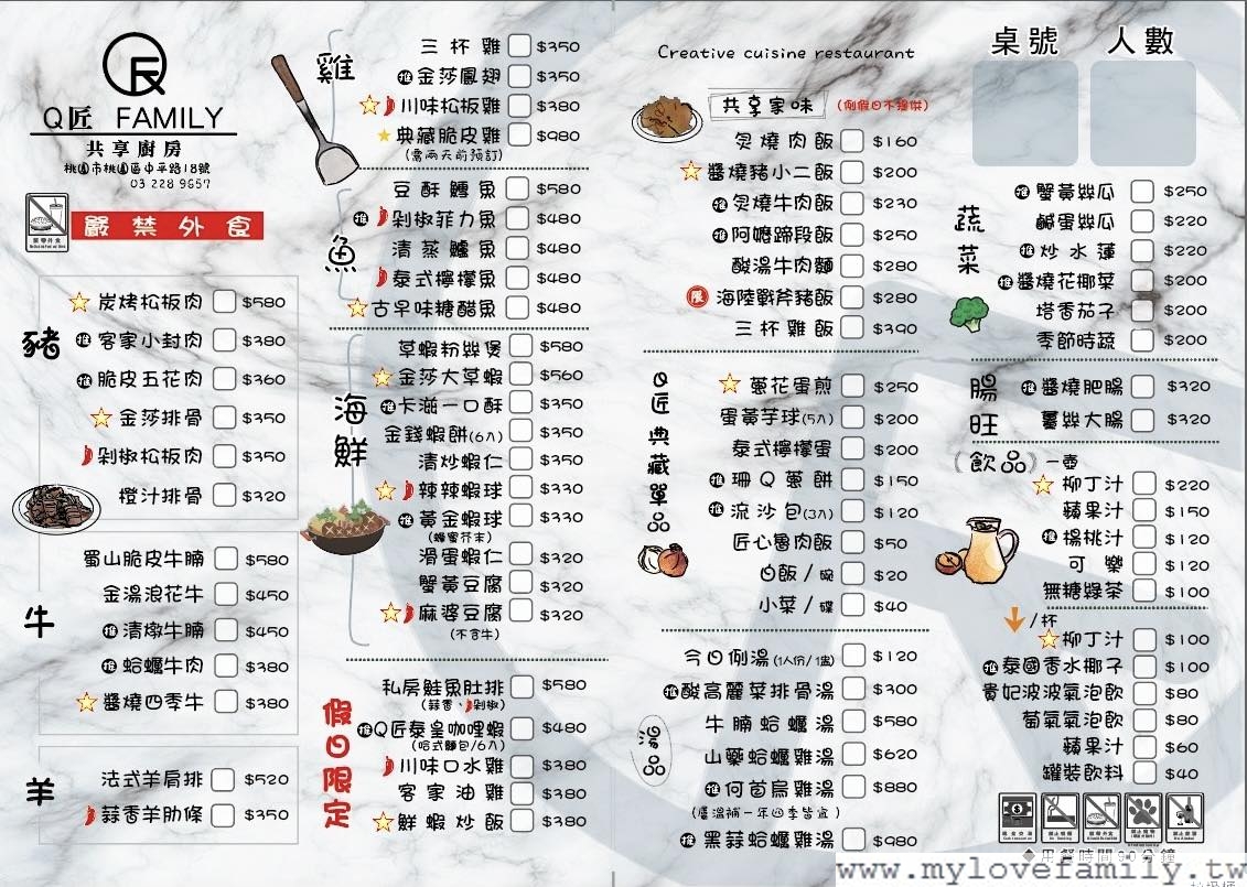 Q匠Family共享廚房來看看最新菜單,我們看了這張菜單足足看了五分鐘而無法做任何決定,是的,因為每一樣都想吃,我的天啊~這真的太誇張了,我們七嘴八舌討論著,什麼都想吃,但又怕吃了變胖,好煎熬的心情…